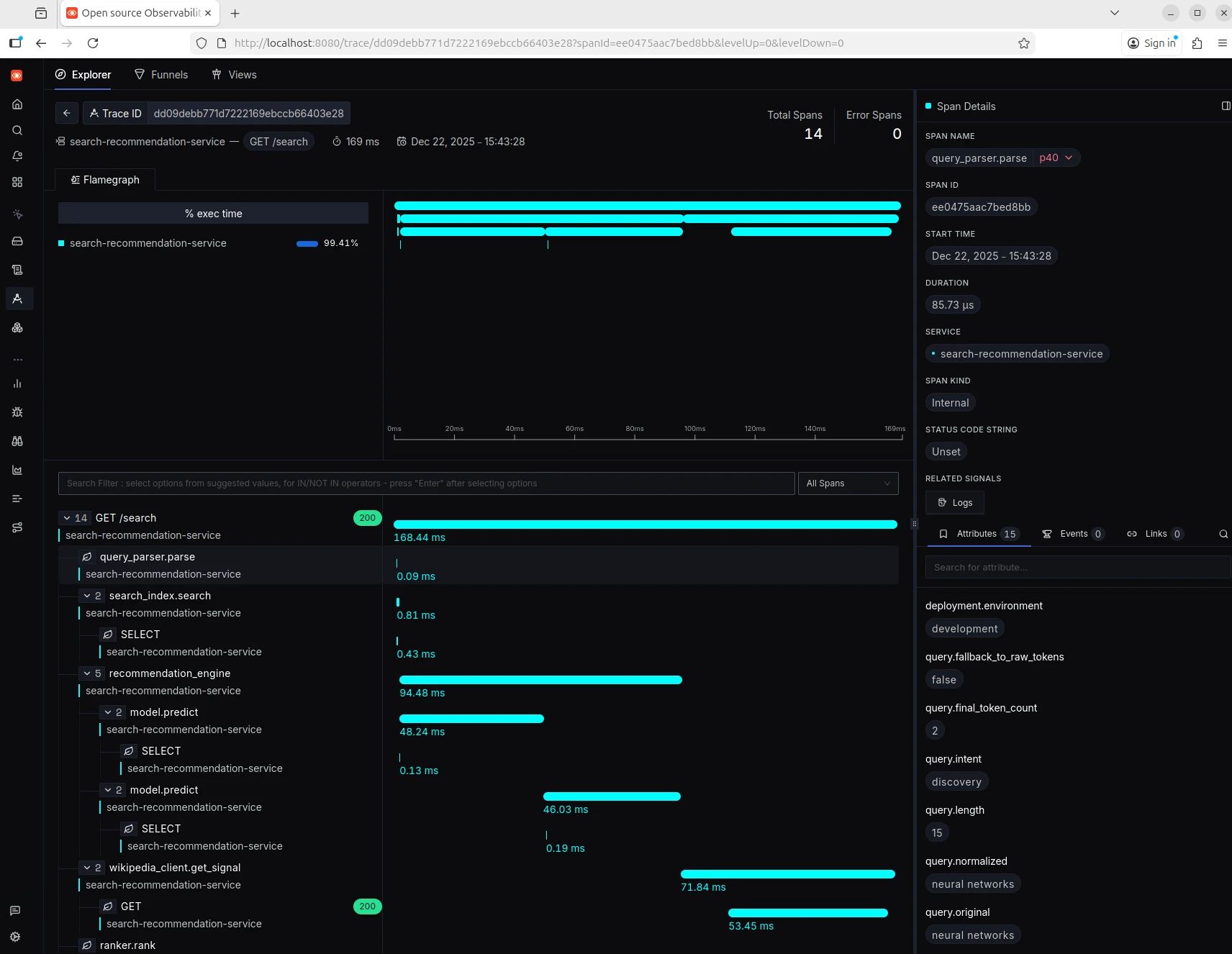 Slapping OTel code into all of your applications and exporting the output to a database, alone, won't get you to the observability promised land. Remember, if your software is poorly written and your systems of applications aren't structured well, OTel won't do you much good. How useful is a detailed trace if your software isn't structured so that there are clearly defined modules to track? You also need to proactively think about failure modes too. For ML recommender portion of this project, I needed to take stock of what attributes would be most helpful should I need to find very subtle issues during model inference.