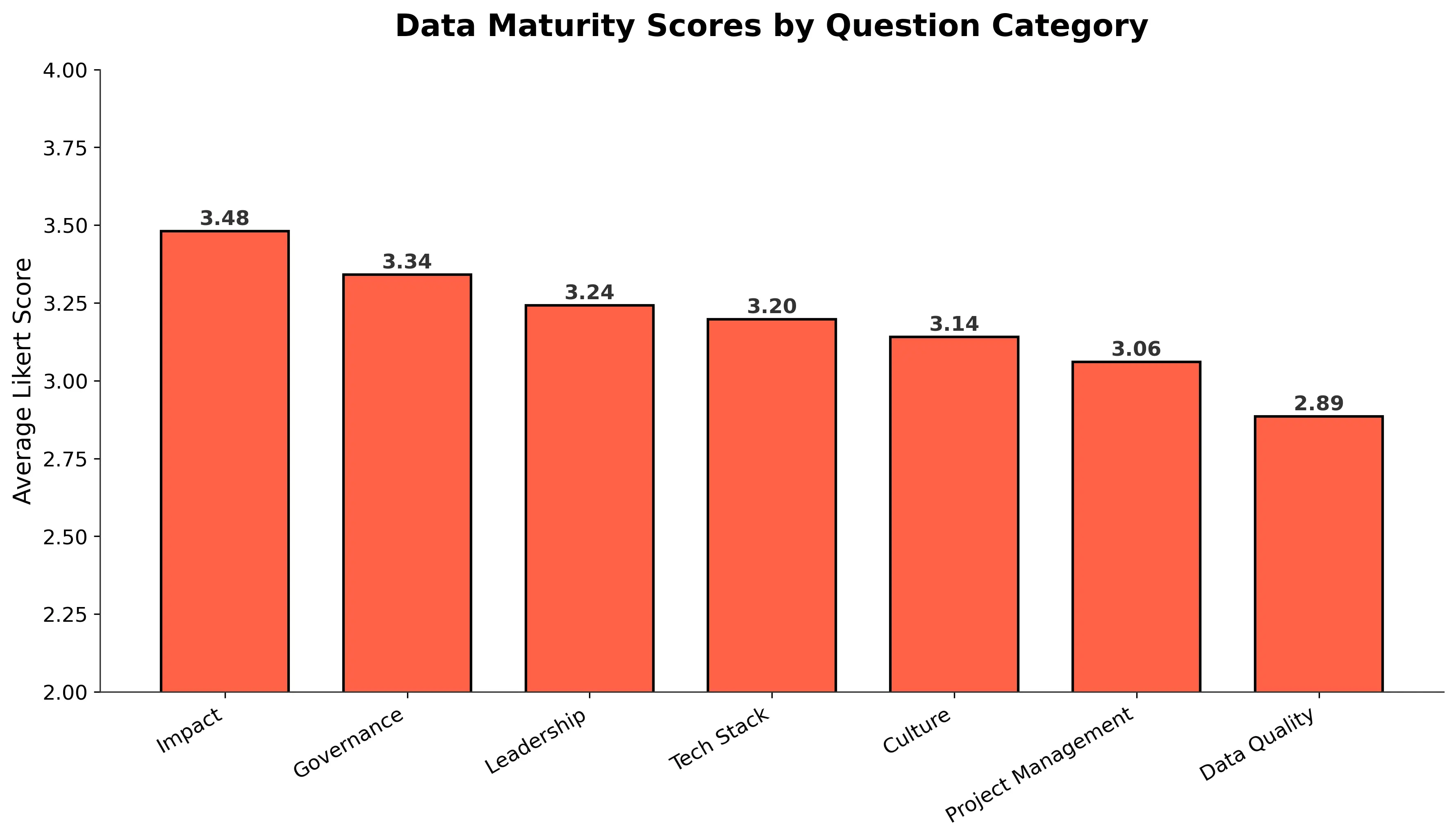 The highest-scoring dimension is Impact at 3.48. This suggests that when data teams do get their work into production, it tends to matter. People outside the data team recognize the value. In fact, one of our highest-scoring individual questions (3.88) was "Employees outside the data team advocate for its importance." That's encouragingāit means the work isn't going unnoticed.