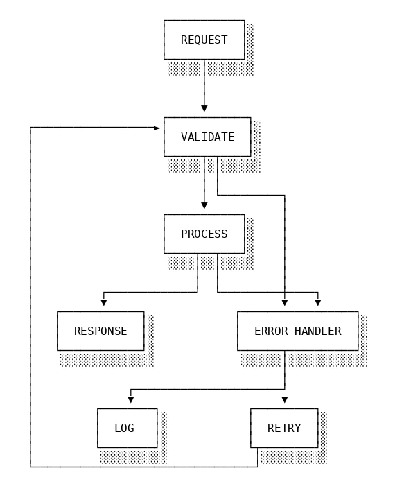 REQUEST -> VALIDATE VALIDATE -> PROCESS PROCESS -> RESPONSE VALIDATE -> ERROR HANDLER PROCESS -> ERROR HANDLER ERROR HANDLER -> LOG ERROR HANDLER -> RETRY RETRY -> VALIDATE